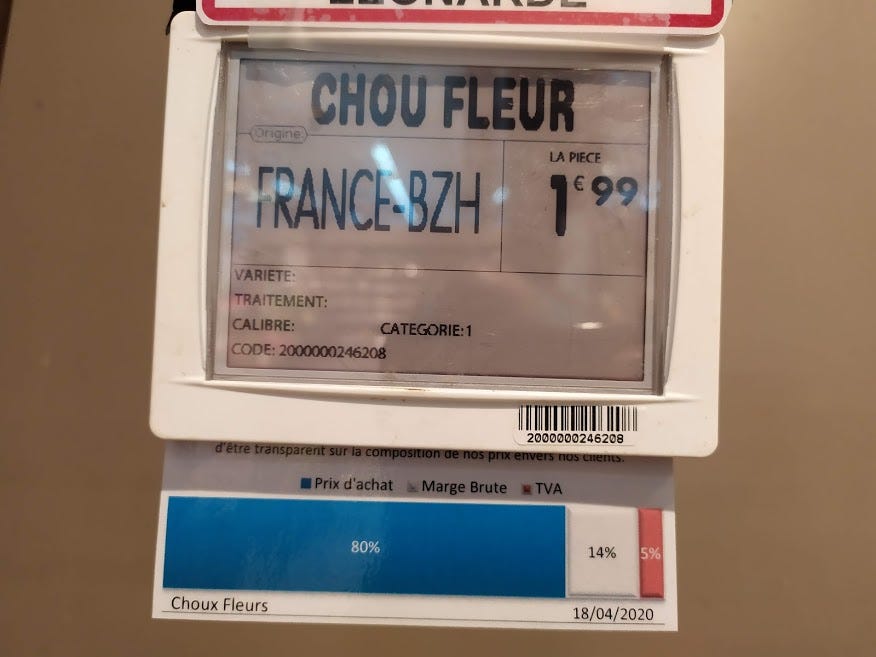 This one is particularly fun because these cauliflowers are very likely to have come from the fields around our home! Back to that ticket. The blue bit is the price the shop paid for the cauliflower, the white bit is the shop’s margin and the red bit is the VAT.