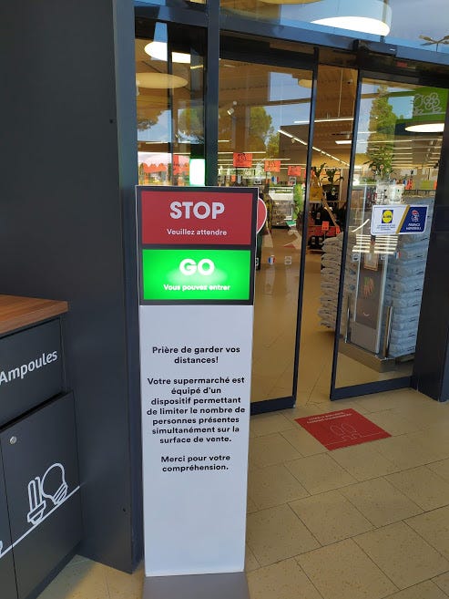 This was an interesting one. Many shops have limits on the number of people that are allowed in and one local Lidl has put in place a technological solution to counting people in and out and signaling whether there is space available for another shopper…