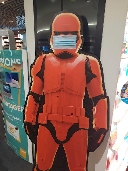 They may be really bad at accurately blasting people but even Stormtroopers in France know how to stay safe…